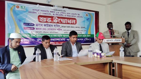 কুয়াকাটা প্রতিনিধি : কুয়াকাটায় সম্পূর্ণ সরকারি খরচে ০৩ (তিন) মাস মেয়াদি ফ্রি হোটেল ম্যানেজমেন্ট, ই-টিকেটিং ও রিজার্ভেশন কোর্সের শুভ উদ্বোধন অনুষ্ঠিত হয়েছে। বুধবার (০৪ ফেব্রুয়ারি) সকাল ১০টায় কুয়াকাটা পৌরসভা অডিটোরিয়ামে আয়োজিত উদ্বোধনী অনুষ্ঠানে প্রধান অতিথি হিসেবে উপস্থিত ছিলেন কলাপাড়া উপজেলা
