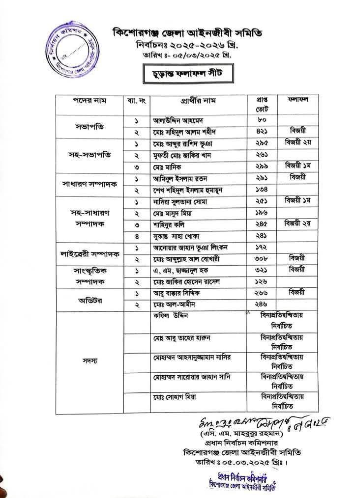কিশোরগঞ্জ আইনজীবী সমিতির নির্বাচনে আওয়ামীপন্থী সভাপতি ও বিএনপিপন্থী সাধারণ সম্পাদক নির্বাচিত ।