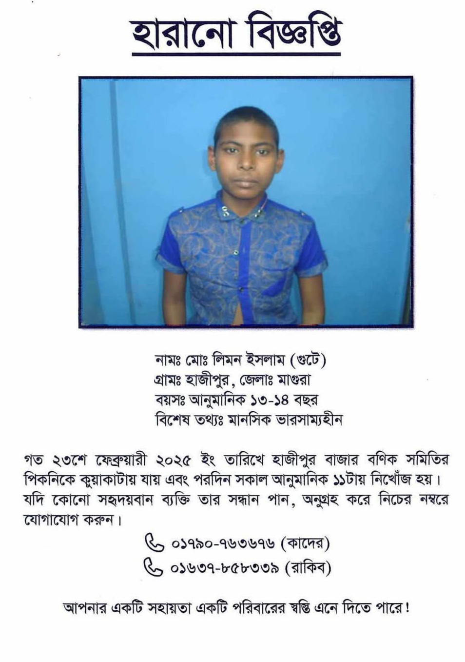 স্বজন ফিরে পেল হারিয়ে যাওয়া লিমনকে